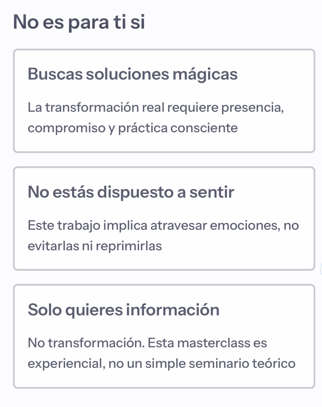 Esta masterclass abre la puerta a un trabajo más profundo y sostenido. Es el primer paso en un viaje de reconexión contigo mismo que puede llevarte mucho más lejos de lo que imaginas
